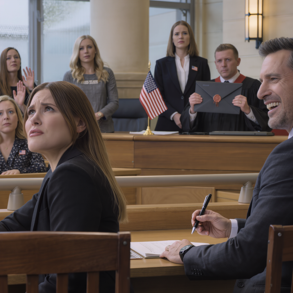 The pen glinted under the courtroom lights, and Caleb’s laugh came out low and confident—too loud for a place that smelled like floor wax and old coffee. On the edge of the clerk’s desk sat a tiny American flag magnet, the kind somebody picked up at a harbor gift shop and never bothered to remove. It caught the fluorescent glare every time the air vent clicked on. Somewhere in the hallway, an aging radio in a bailiff’s booth was leaking a scratchy Sinatra chorus into the sterile hush.
