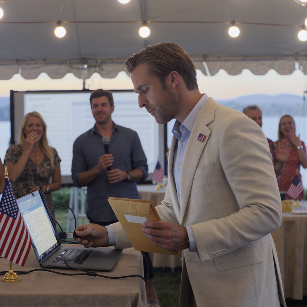 I kept my face calm and my shoulders loose. In one hand, I held a plain manila envelope that looked harmless, almost boring. In my pocket, a small USB drive pressed against my thigh like a coin you couldn’t stop turning over. Brandon’s voice carried over the crowd—confident, practiced—talking about legacy and torches and responsibility.