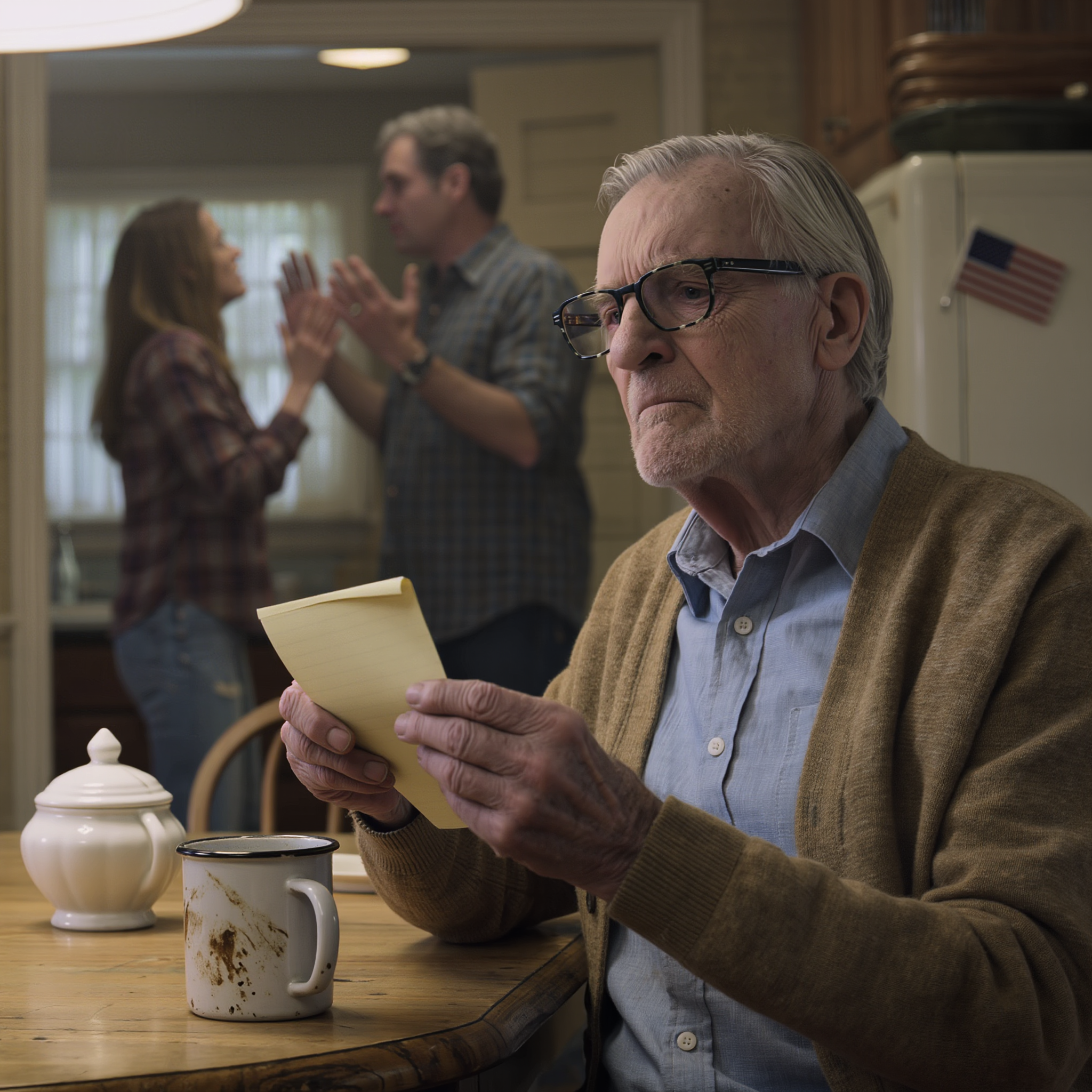 That’s when I saw the cream-colored page, torn from one of those expensive legal pads my daughter, Monique, has been carrying since she married “up.” It lay on the table next to the sugar bowl, right under that little flag magnet I’d set down earlier without thinking.
