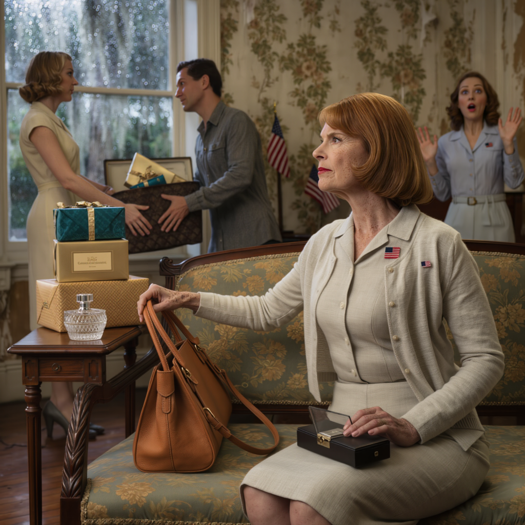 Beside it, she set a crystal perfume bottle—some rare vintage scent from a house that no longer existed—and then a Swiss watch, mother-of-pearl face, a halo of diamonds catching every bit of light like moonrise on the Savannah River.