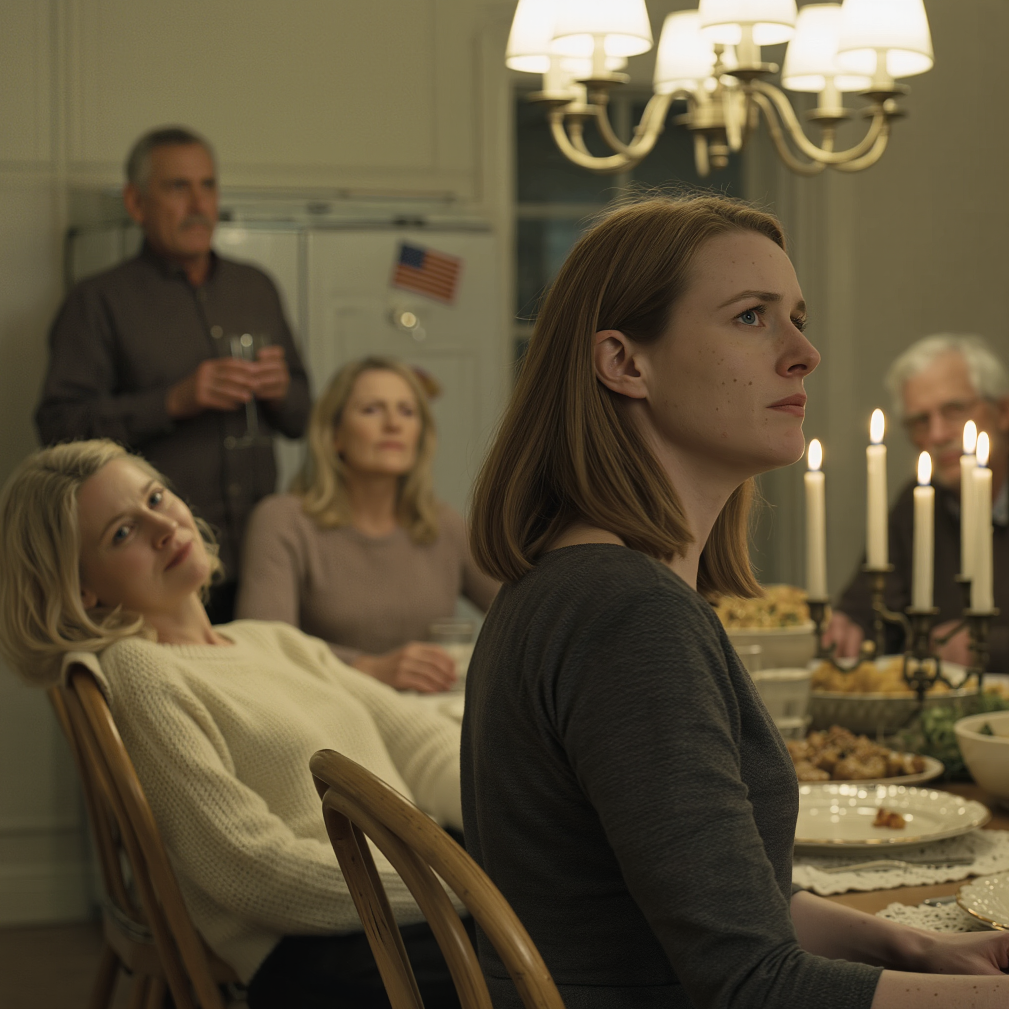 When it was time to sit, we squeezed around the long wooden table my parents had owned since I was in high school. Extra leaves extended it for aunts, uncles, and cousins. Candles flickered down the center between dishes of mashed potatoes, green beans, stuffing, and turkey. Sinatra had given way to a playlist of holiday standards humming low from the kitchen. The flag magnet on the fridge peeked at me every time I glanced toward the doorway.